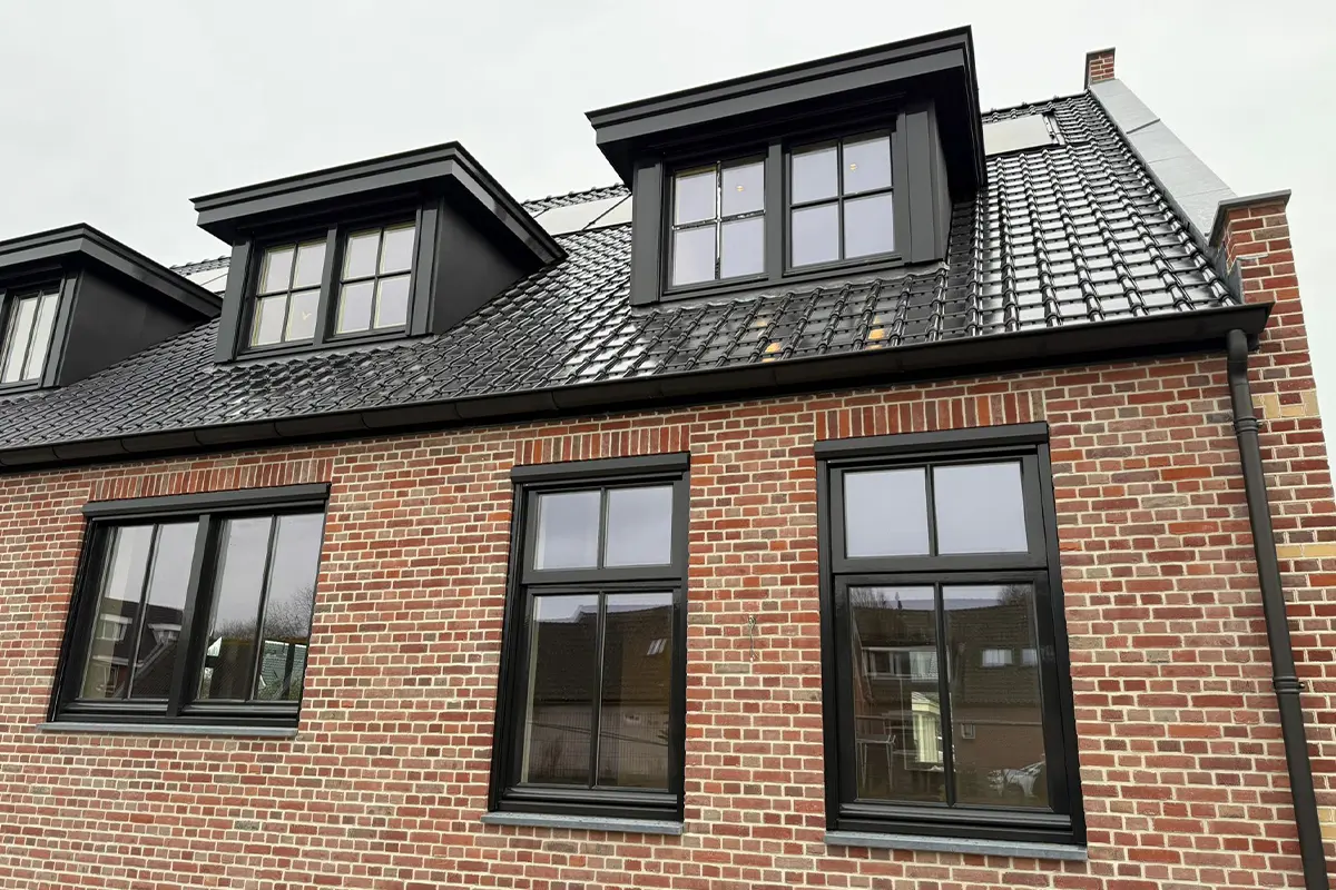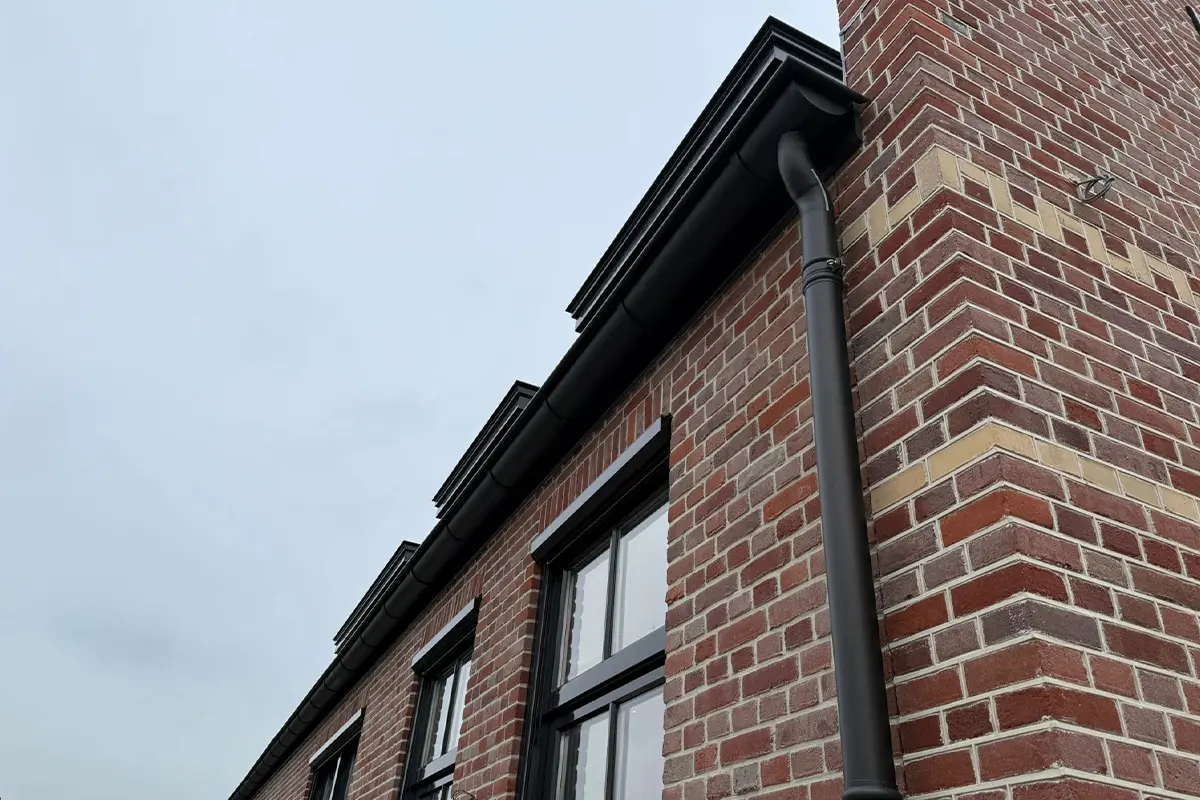 • Het leveren en monteren van de zinken goten, zijwangen dakkapellen en hemelwaterafvoeren in de kleur zwart